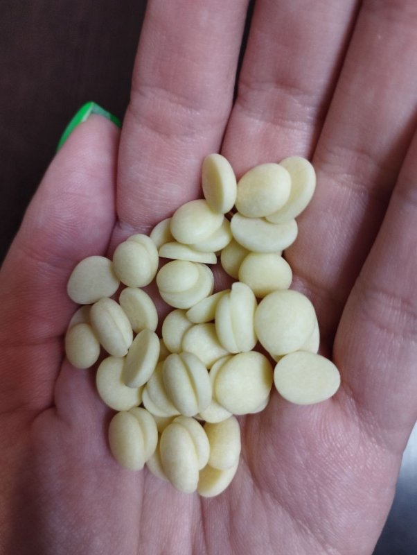 Какао-масло в небольших каллетах, без отдушек и лишних привкусов, легко топится и хорошо окрашивается. Незаменимый помощник при работе с шоколадом.