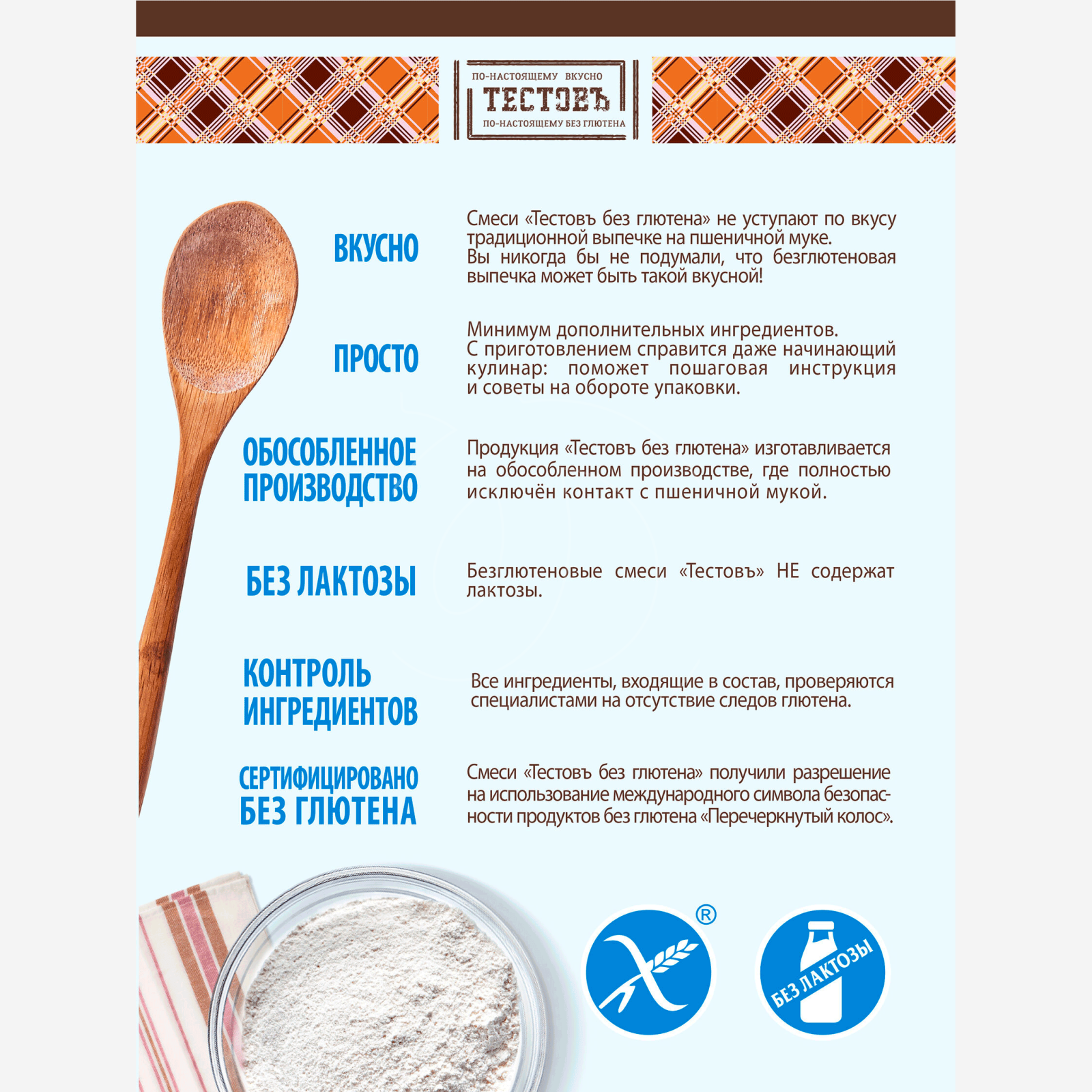 - Смесь включает основу из рисовой, кукурузной или другой безглютеновой муки с добавками для правильной текстуры.